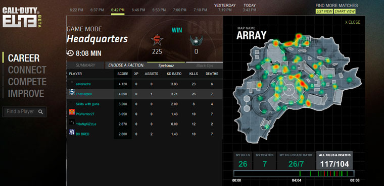 El servicio de 'Call of Duty: Elite', vamos a tener la posibilidad de acceder a un resumen de nuestras estadísticas de todo el juego mediante el Career Summary, además Recent Matches nos va a mostrar también estadísticas, pero solo de las partidas más recientes, es de esperar que con información más detallada que el Career Summary. Challenger nos mostrará el progreso que hemos alcanzado en nuestras partidas multijugador y con Custom Classes vamos a poder crear clases y modificar las ya existentes para luego disfrutar con ellas en el juego. Otra de las funcionalidades que vamos a obtener, es poder mantener el contacto con aquellos usuarios que tengamos incluidos en nuestra lista de amigos.