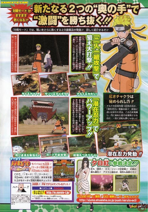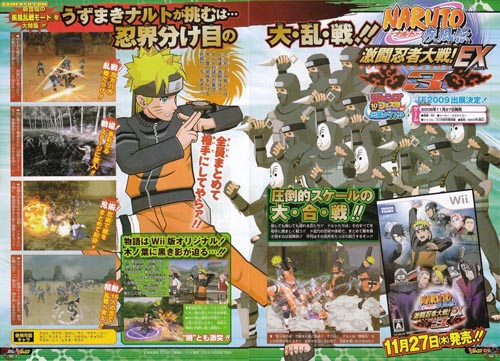 Aquí tenéis algunos de las nuevas imágenes de Naruto Shippuden Gekito Ninja Taisen EX 3 para Wii publicadas en el último número de la revista V-Jump. El juego estará disponible el 27 de Noviembre en Japón.