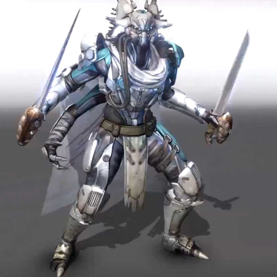 Mucho cuidado, este bicho parece peligroso. Tiene cuatro brazos, dos a cada lado del cuerpo, y con los dos superiores empuña sendas espadas. Sus movimientos son directos y devastadores, como te alcance uno de sus ataques te deja tieso. Yo me cuidaría muy mucho de acercarme a él.