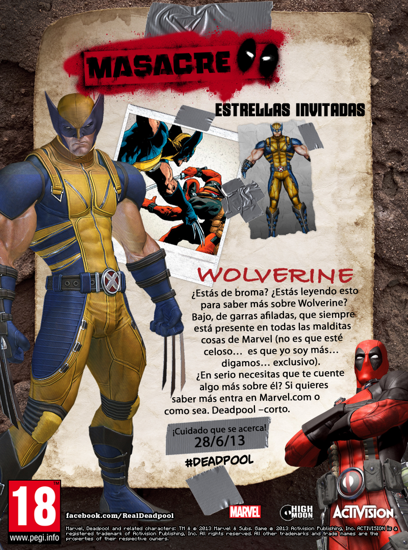 "Hey, ¡mira! Es el personaje de comic favorito de todo los tiempos, Wolverine, que ahora aparece también en otro sitio, MI, aún por llegar, nuevo videojuego de Activision Publishing, Inc. y Marvel Entertainment, MASACRE, protagonizado por mí y por nadie más. ¡¿Quién ha aprobado esto?! ¿Por qué a todo el mundo le gusta Wolverine si yo soy muchísimo más guay? ¿Quién tiene el traje con los colores más bonitos? Masaac... ¿Quién es capaz de mantener enfrentamientos tanto cara a cara como a distancia? ¡Masacre! ¿Quién se ha visto obligado a olvidar su pasado, como una PERSONA NORMAL, en lugar de dejarse en manos de la amnesia? ¡Yo! Pff... Un jefazo me está diciendo que por contrato me obligan a decir UNA cosa agradable sobre Wolverine antes de que venga, así que ahí va una... Querido Wolverine: Imagino que, comparado con la larga historia de conflicto humano y sufrimiento, la vestimenta desfasada que te empeñas en llevar no está TAN mal.Firmado, Masacre"